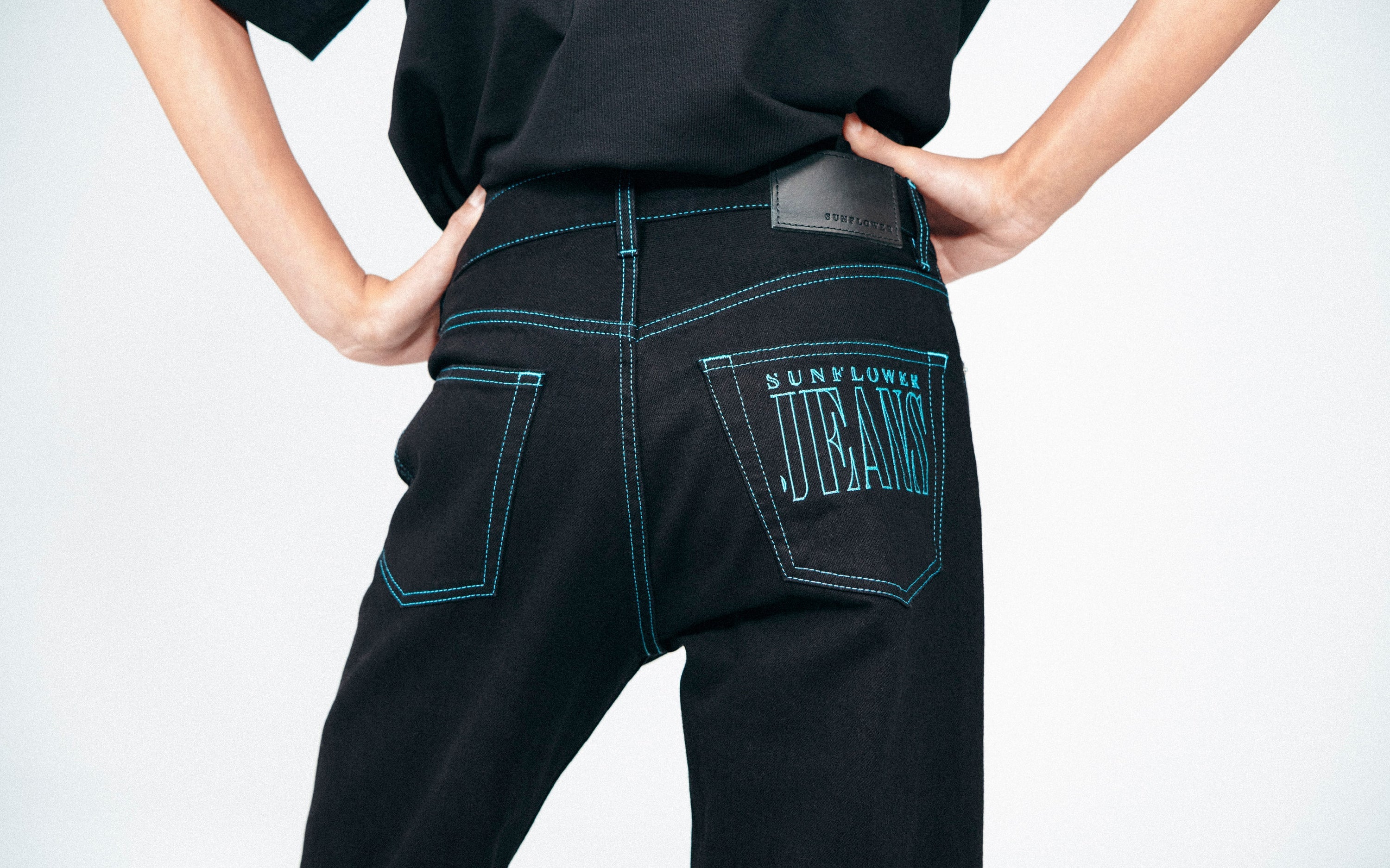 “We are deadly serious about Sunflower Jeans upholding a positive message for the environment. Jean production is traditionally very toxic in so many ways, and we worked hard to make ours as sustainably as possible. But when it came to the design, we dd not take ourselves seriously at all – it’s denim, it’s casual. So with the styling and washed we did a little homage to ’90s denim, all fun and super free.”